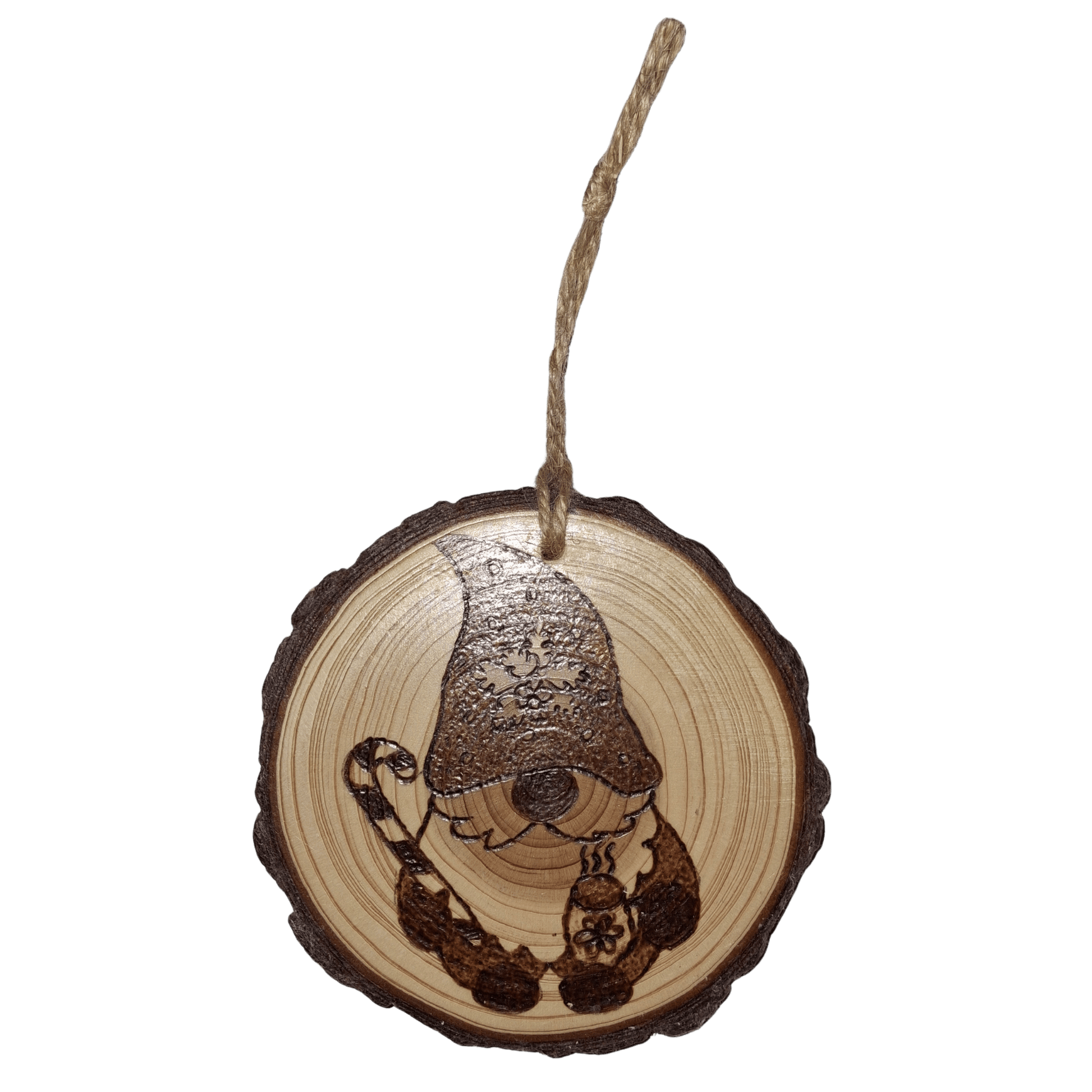 Hand-decorated with pyrography and finished with high-quality furniture wax, these unique log slices are perfect for your Christmas tree. Each one is 6-9cm and includes a short length of jute rope for hanging.
